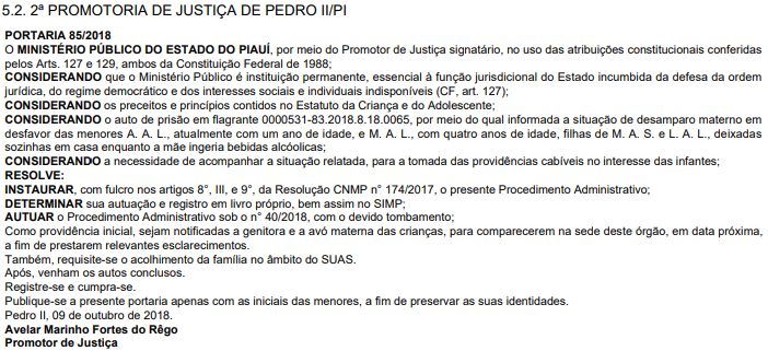 Como providência inicial, o promotor Avelar Marinho Fortes do Rêgo solicitou que sejam notificadas a genitora e a avó materna das crianças, para comparecerem na sede deste órgão, a fim de prestarem relevantes esclarecimentos.
