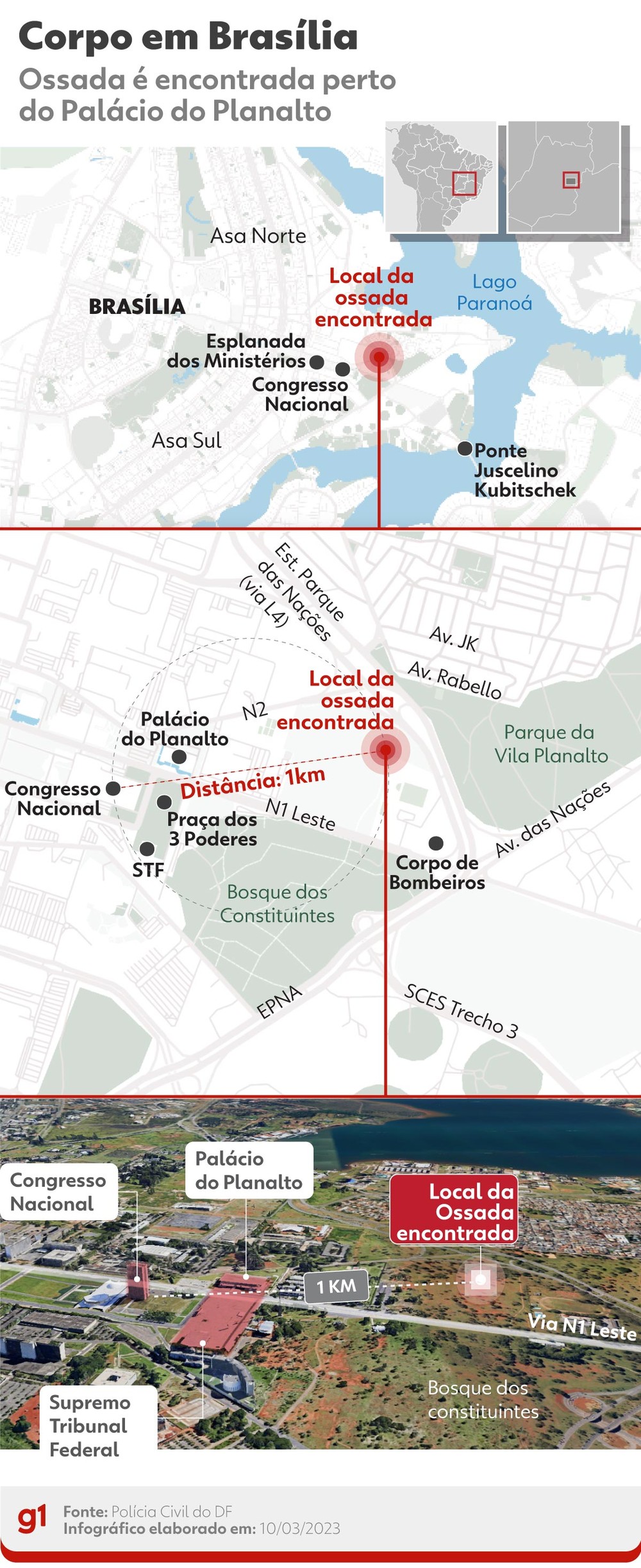 A região onde o corpo foi encontrado está localizado em uma mata, entre o Palácio do Planalto e o 1º Grupamento do Corpo de Bombeiros do Distrito Federal (veja mapa abaixo).